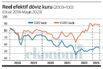 2003 yılı ortalaması 100 olan reel efektif döviz kuru endeksi mayıs ayında TÜFE bazlı hesaplamaya göre 57.92 düzeyinde. Yaklaşık 58; yani TL, TÜFE bazlı hesaplamaya göre 2003 yılına kıyasla yüzde 42 aşağıda.