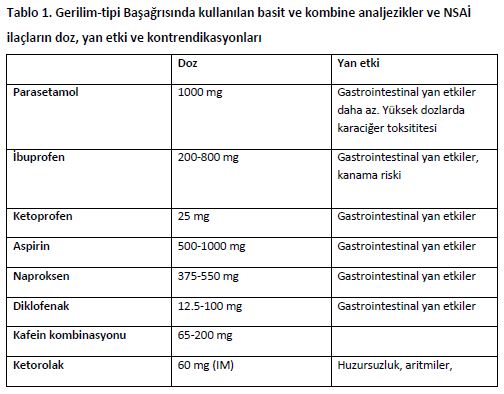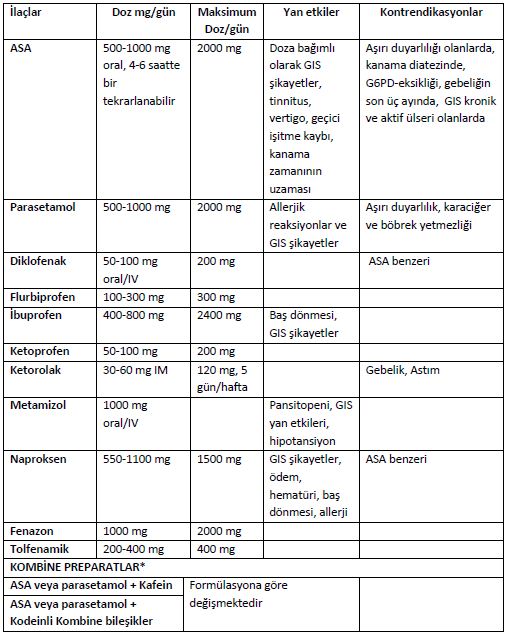 • Basit ve kombine analjeziklerin(NSAİilaçlardahil) önerilen doz, yan etki ve kontrendikasyonları Tablo 1’de verilmiştir.