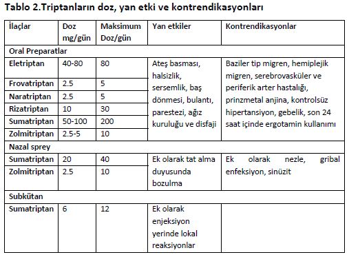 • Triptanların doz, yan etkileri ve kontrendikasyonları Tablo 2’de verilmiştir.