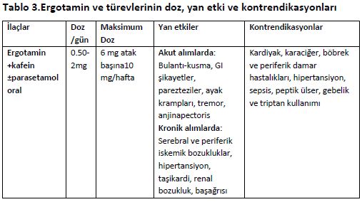 • Ergotamin ve türevlerinin doz, yan etki ve kontrendikasyonları Tablo 3’de verilmiştir.