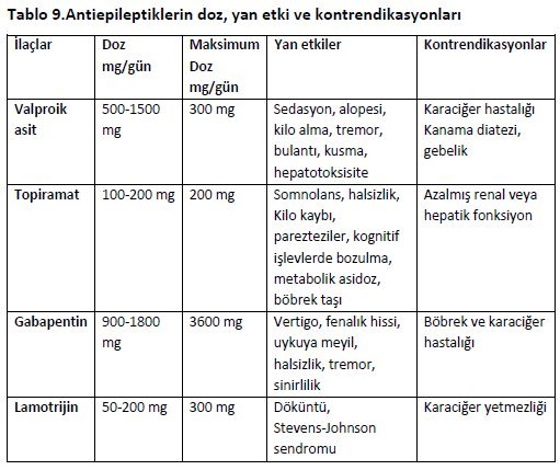 • Kullanılan doz, yan etkileri ve kontrendikasyonları ile Tablo 9’da verilmiştir