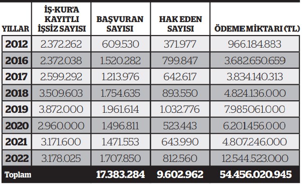 Dünyadaki 94 ülkenin nüfusundan fazla sayıda işsizi olan Türkiye’deki işsizliğin ulaştığı boyut, İŞKUR’un verilerine de yansıdı. 2012 yılında 609 bin 530, 2018 yılında 840 bin 793 olan işsizlik ödeneğine başvuran sayısı, 2022 yılı sonu itibarıyla 1 milyon 707 bine fırladı.