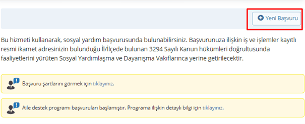 Bu kısımdan aile destek başvuruları da yapılır. Aile ve Sosyal Hizmetler Bakanlığı, yardımları ihtiyaca göre belirlediği için tek bir yerden alır. “ Yeni Başvuru ” seçeneğine tıklayarak başvurunuz onaylandığı takdirde burs ihtiyacınız olduğunu kaymakamlığa belirtebilirsiniz.