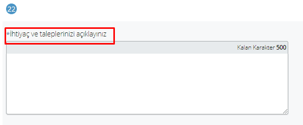 22. soruda ihtiyaç ve taleplerin belirtileceği bir alan vardır. Burada öğrencinin burs ihtiyacı olduğu belirtilmelidir. Buradan başvuru yaptıktan sonra kaymakamlıklarda bulunan sosyal yardımlaşma ve dayanışma vakfına gitmek gerekir. Buradan bizzat başvuru yapılmalıdır.