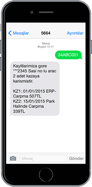 Türk Telekom hasar kayıt sorgulama SMS servisi olarak 5664 nolu hat belirlenmiştir. 5664’e araç plakasını SMS olarak iletiniz. Birkaç dakika içerisinde araca ait tüm hasar kayıt bilgileri size kısa mesaj olarak iletilecektir.