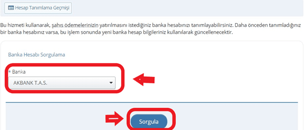 Yukarıdaki ekrandan bankanızı tercih ederek “ Sorgula ” seçeneğine tıkladığınızda otomatik olarak bilgileriniz ekrana gelir. Hangi hesabınıza paranın yatmasını istiyorsanız onu tercih ederek işlemlerinizi tamamlayabilirsiniz.