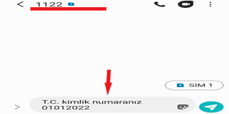 Yukarıdaki görseldeki gibi mesaj kısmına T.C. kimlik numaranızı yazmalısınız. Ardından doğum tarihinizi gün, ay, yıl sıralamasına uygun şekilde yazmanız gerekir. Burada dikkat etmeniz gereken doğum tarihinizi, aralara nokta ya da tire işareti koymadan bitişik yazmaktır. Aynı zamanda T.C. kimlik numarası ve doğum tarihi arasında bir boşluk olmalıdır.