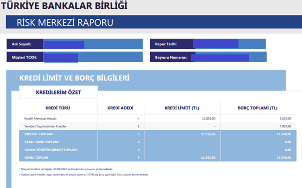 Şifrenizi girdikten sonra açılan raporda bankalara olan toplam borcunuz, gecikmiş borçlarınız ve takibe düşenler yer alır. Aynı zamanda çeklere, senetlere ve kredilere ilişkin bilgiler de raporda bulunur.