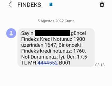 Görselde bir cihaz sorgulama işleminin sonucu gösterilir. Buna göre Findeks kredi notu 1900 üzerinden hesaplanır. Görselde yer alan Türk Telekom abonesinin puanı ise 1647’dir. Mesajda bu puanın iyi bir seviyede olduğu da ifade edilir. Yapılan sorgulama karşılığı Türk Telekom abonelerinden, 17,5 TL ücret kesilir.