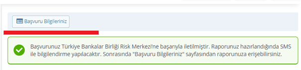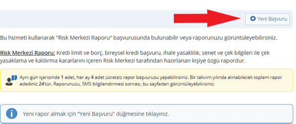 “Risk Merkezi Raporu Başvurusu” kısmına tıkladığınızda açılan ekrandan başvurunuzu gerçekleştirebilirsiniz. Görüntüde okla gösterilen “ Yeni Başvuru ” kısmına tıklayarak bir sonraki ekranda bilgi kontrolünü sağladıktan sonra “Başvur” butonuna tıklayabilirsiniz.