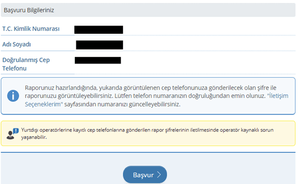 “Yeni Başvuru” kısmına tıkladığınızda karşınıza gelen ekran yukarıda yer alır. Raporunuz hazırlandığında sistemde kayıtlı olan telefon numaranıza SMS gönderilir. SMS geldikten sonra “ Başvuru Bilgileriniz ” kısmına tıklayarak rapora erişebilirsiniz.