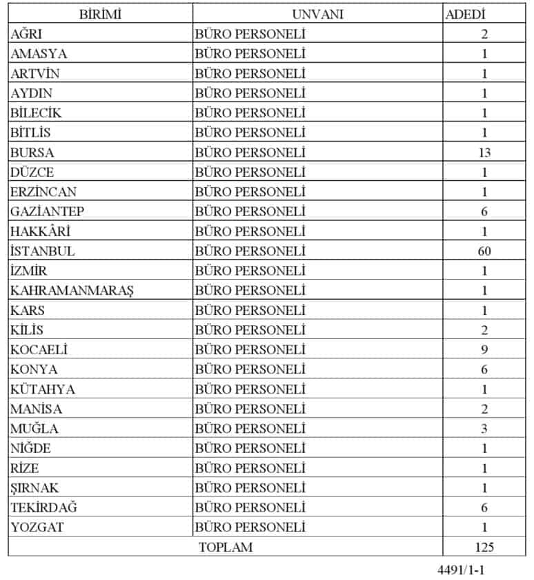 125 sözleşmeli büro personel alımının kadro dağılımı şu şekildedir: