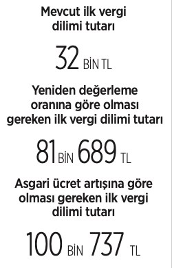 İlk vergi dilimi yeniden değerleme oranı kadar artsaydı 81 bin 689 TL, asgari ücret kadar artsaydı 110 bin TL olabilirdi.