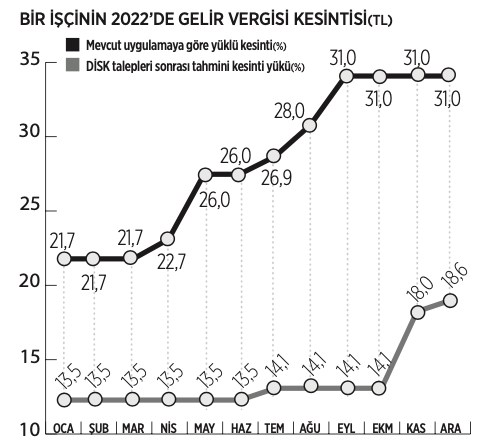 2021 ve 2022 yıllarında yaşanan yüksek enflasyon nedeniyle çalışanlar çok daha hızlı biçimde ikinci ve üçüncü vergi dilimlerine girmeye başladı. Çalışanlar nisan ve mayıs aylarında ikinci vergi tarife dilimi olan yüzde 20’ye, ağustos ve eylül ayında ise üçüncü tarife dilimi olan yüzde 27’ye girdi ve ciddi kayıplar yaşadı.