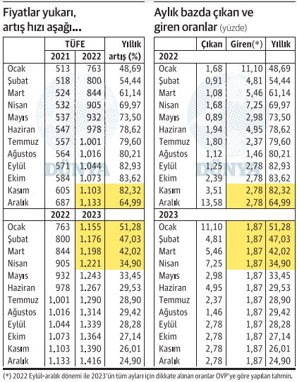 “2023’te fiyat artış hızının bu düzeyde kalacağı ne malum” diyebilirsiniz tabii ki. Benim yaptığım orta vadeli programa dayalı bir tahmin. Hadi aylık artış yüzde 1.87 değil de yüzde 2.87 olsun, yüzde 3.87 olsun; 2023’ün ilk dört ayında yıllık enflasyon hızı yine de gerilemeye devam edecek. Çünkü tablodaki sarı kutuları görüyorsunuz, bu yılın ilk dört ayındaki oranlar çok yüksek.