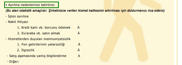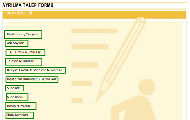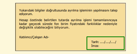 Dilekçede ayrılma nedenleri de belirtilmelidir. Ayrılma nedenleri; işten ayrılma, nakit ihtiyacı vb. olabilir.